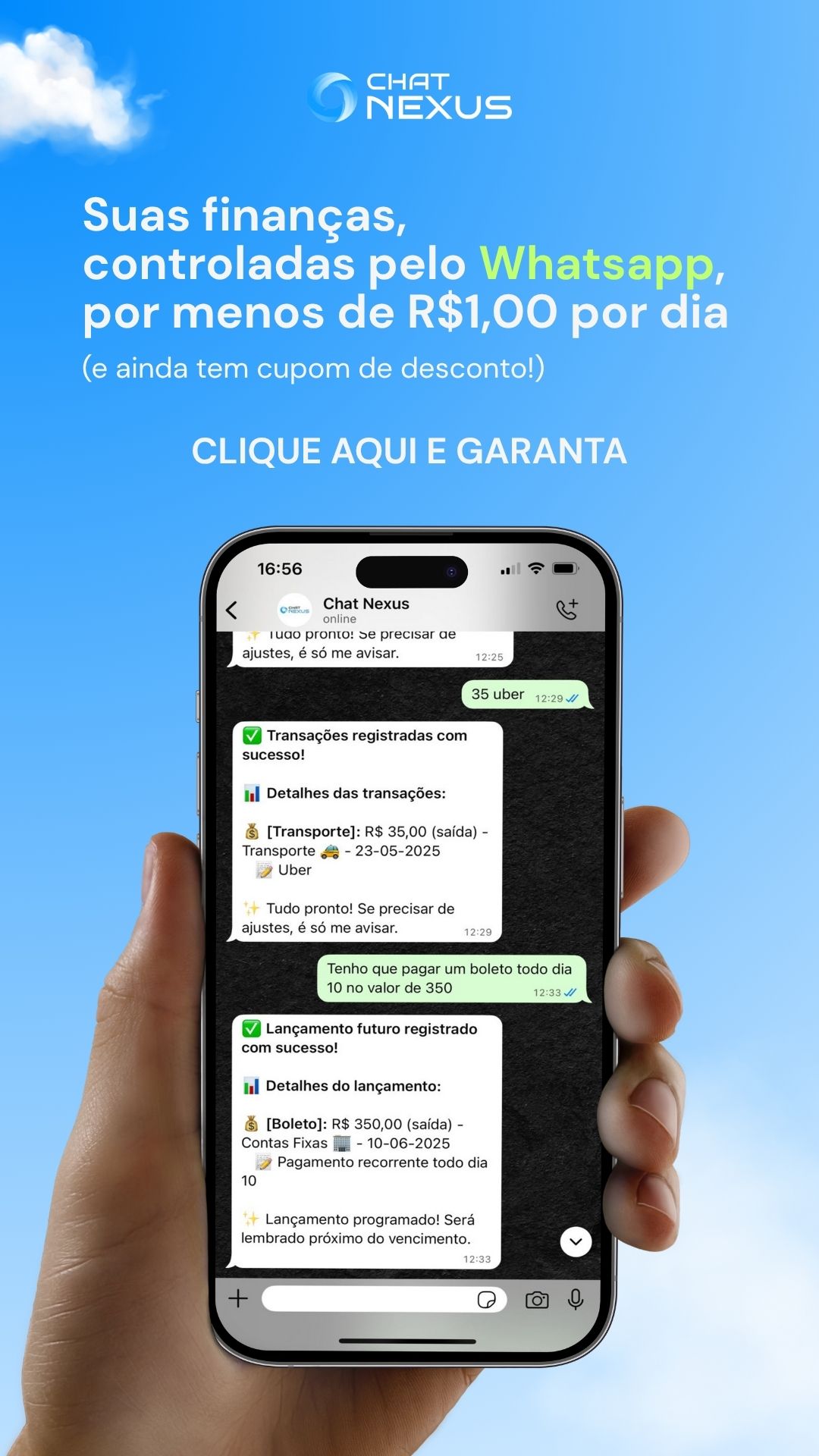 Seus sonhos financeiros não precisam ficar apenas no campo da imaginação. Com a organização e o controle que o Chat Nexus proporciona, você tem as ferramentas para transformar essas aspirações em metas concretas e alcançáveis. Comece hoje a dar os passos certos para uma vida mais plena e a viver a verdadeira Wealthness.